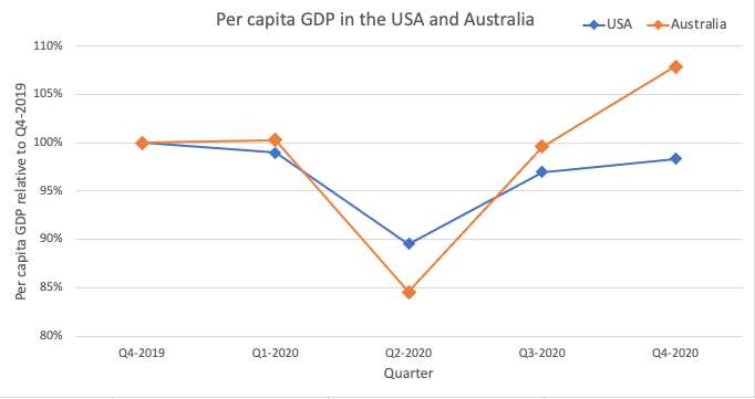All the social distancing did indeed cost the Australian economy – the economy contracted more than the US economy did in quarter 2 of 2020, at the height of the pandemic.