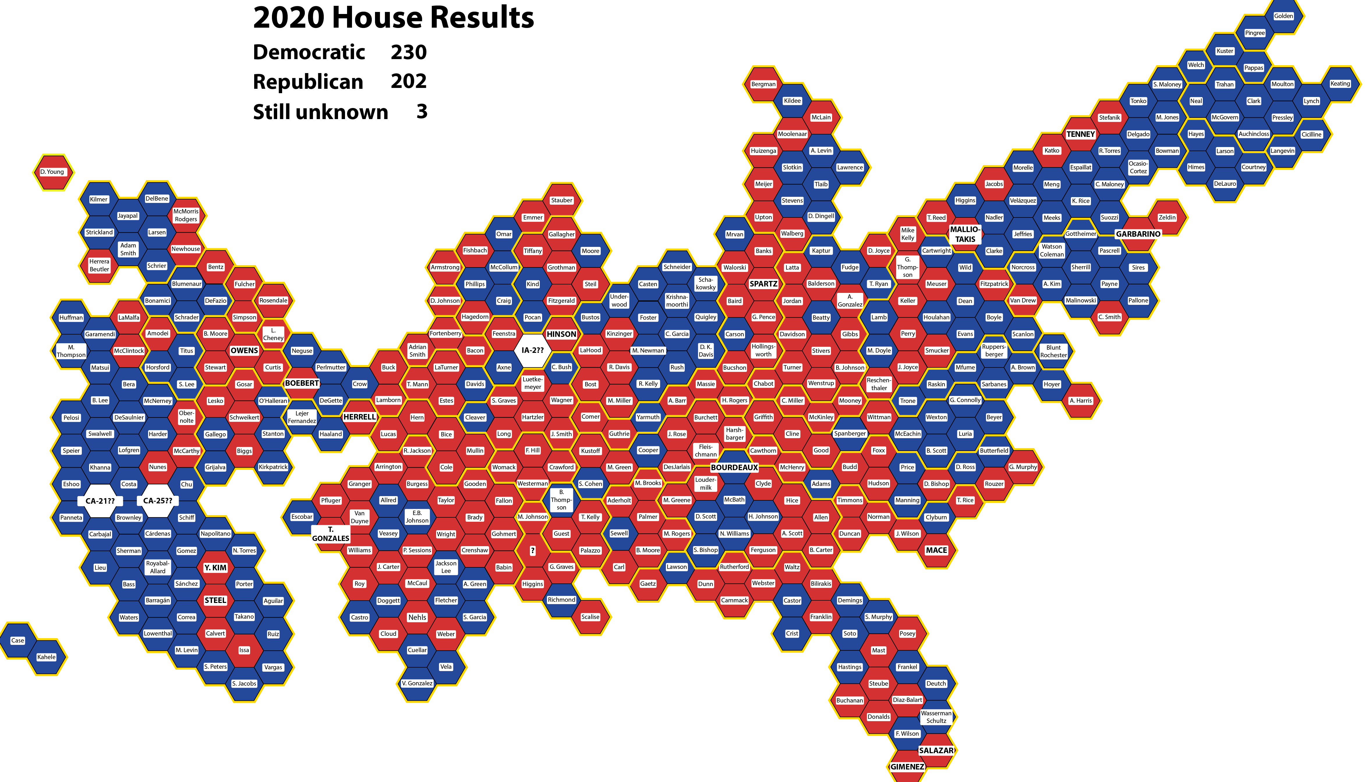 The answer is, “we don’t know for sure yet,” because there are a few elections whose results are not yet known. Both of Georgia’s senate elections finished with no candidate claiming more than 50 percent of the votes, meaning they are headed to a runoff on Tuesday, January 5th, 2021. One runoff election will match Republican David Perdue (49.7% election day vote share) and Democratic candidate Jon Ossoff (47.9%); the other will match the Democratic winner Raphael Warnock (32.9% election day vote share) against the higher vote-getter of the two major Republicans, Kelly Loffler (25.9%). Republicans will be favored to win both elections.