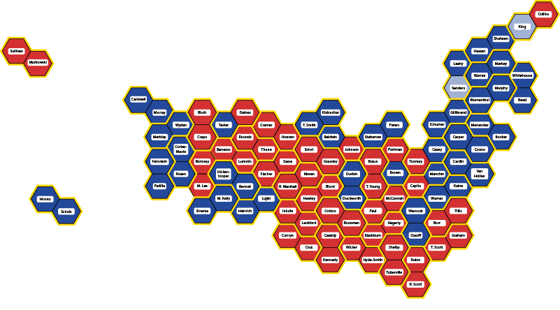 The result is two maps – one for the U.S. Senate and one for the U.S. House of Representatives – that show the distribution of political power in the U.S. legislature as it really is. From there, it’s easy to add the names and political parties of each representative to give a comprehensive picture of the legislature.