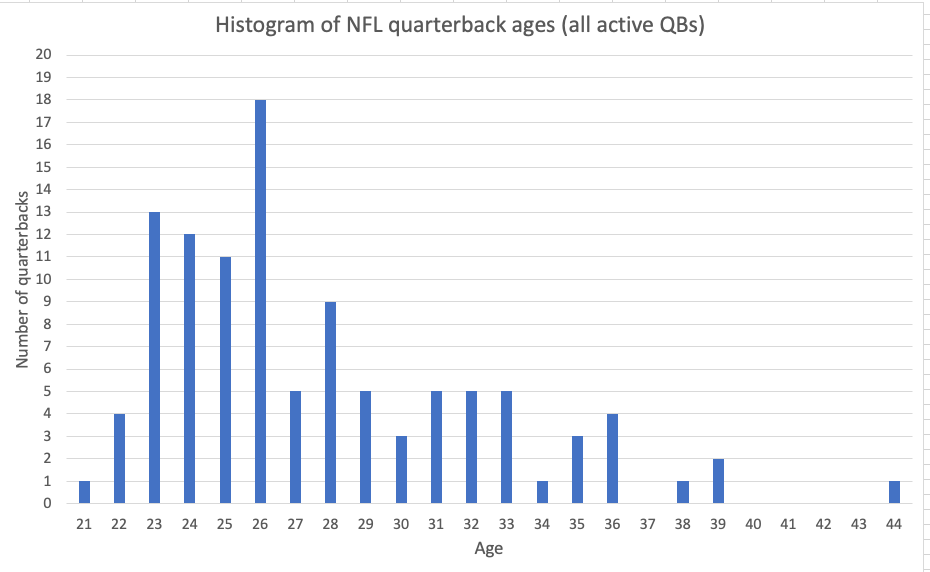 I made a graph (histogram) of the ages of quarterbacks currently playing in the National (American) Football League. The graph is below. Age labels are along the bottom, increasing to the right. Along the left are labels of the number of quarterbacks at each age, increasing going up.
