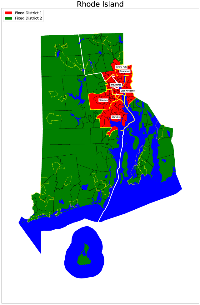 Usual deal with this map: my fixed districts are shown by color: red for District 1 and green for District 2. The white line shows the boundary between the state’s two districts, adopted by the state legislature and signed into law by Republican governor Jim Justice.