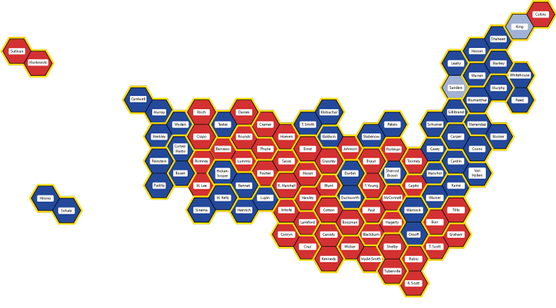 With my passion for data visualization and mapmaking, I figured we can do better. So here is the state of the U.S. Senate at this moment. All states have equal areas in the map, are in their approximate relative locations, and are surrounded by yellow borders. Each hexagon shows one Senator, gives that Senator’s last name, and is color coded by party. Red means Republican, blue means Democratic, and light blue means independents who vote with the Democratic Party. The red hexagons with ? labels mean that we know the Senator will be Republican, but we don’t know which Republican. The white hexagons with ? labels mean that we don’t know either the next Senator or the next Senator’s party. Click on the image for a larger view.
