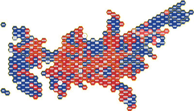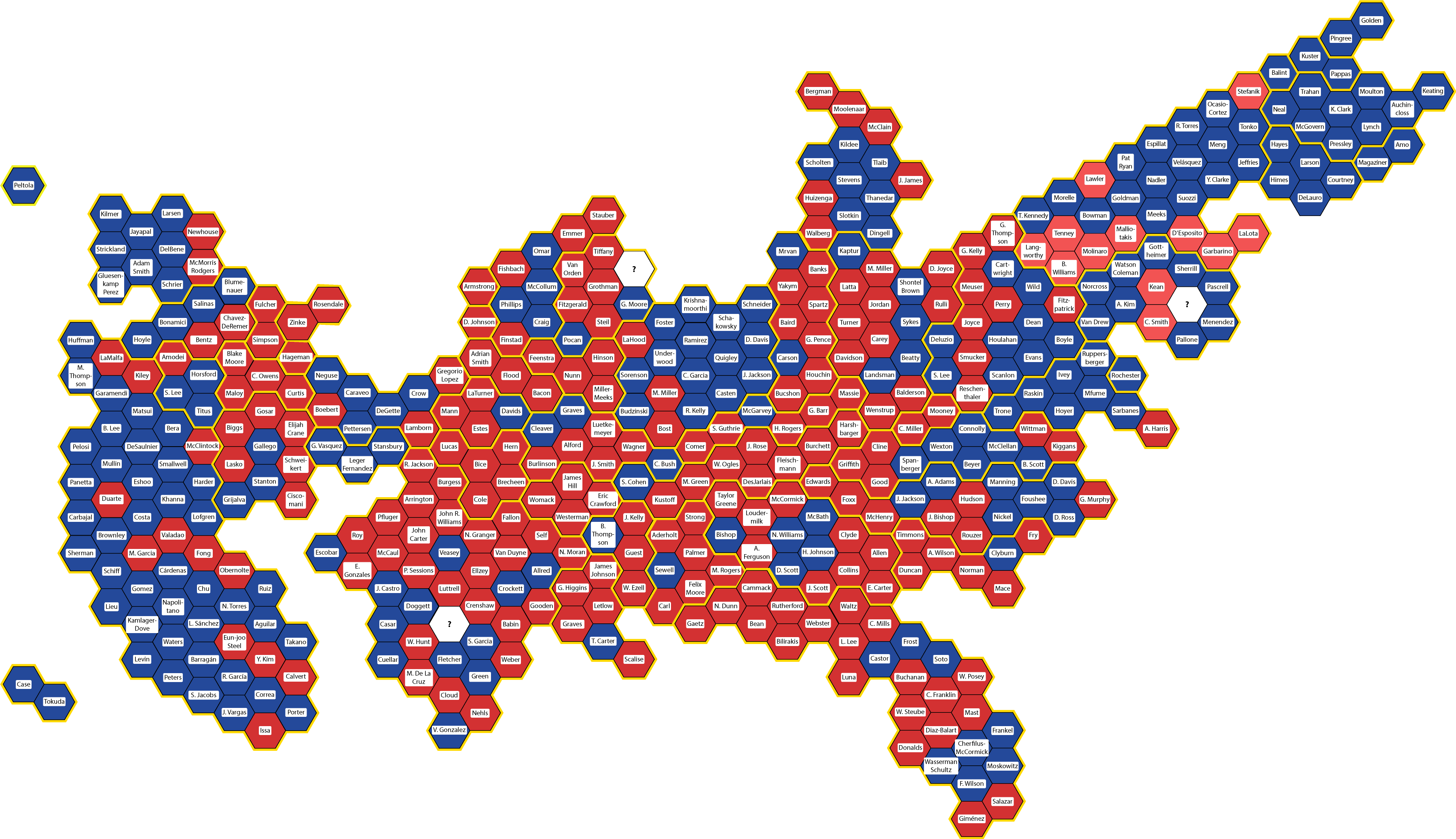 Instead of showing a traditional map that massively distorts the apparent legislative power of large-area states and large-area congressional districts, I made each seat the same size. And because many House districts have completelyridiculousshapes, I displayed each district as the same shape – a hexagon, for easiest tessellation.